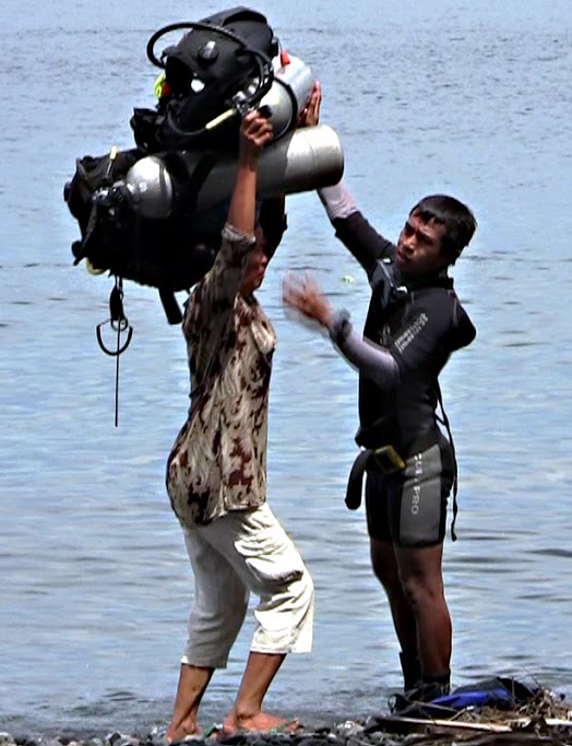 plongée du bord Un petit métier y a vu le jour : « Porteur de bouteille de plongée ». Les autochtones transportent vos bouteilles sur les lieux de l’immersion d’une manière originale… sur leur tête ! Ne les décevez pas, ne portez pas vous-même vos bouteilles. Les courants peuvent être traîtres à Bali, il convient de s’en méfier et ne pas hésiter à demander conseils aux plongeurs locaux. La plus grande prudence s’impose si on observe en surface des mouvements suspects de l’eau. Certains courants en pleine eau peuvent tirer vers le bas. Pour minimiser les risques, il faut se coller aux rochers pour remonter et avoir un gilet de grand volume. |