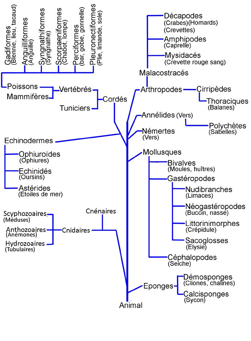 | Les poissons Les crustacés Les mollusques Les Tuniciers Les échinodermes Les cnidaires Les cnétaires |